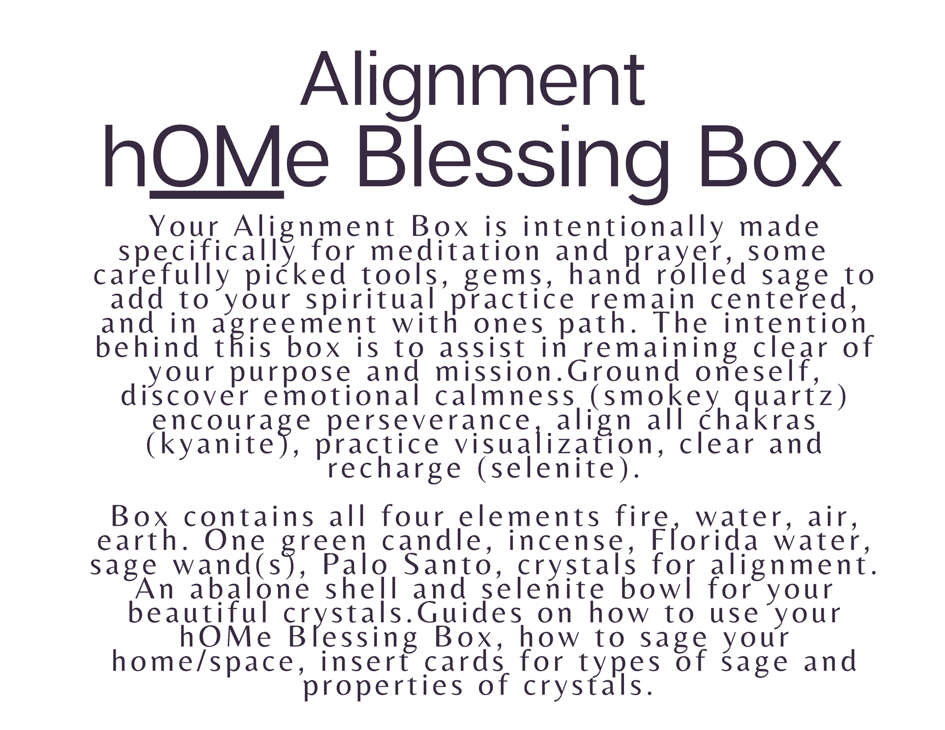 Box contains all four elements fire, water, air, earth. One green candle, incense, Florida water, sage wand(s), Palo Santo, crystals for alignment. An abalone shell and selenite bowl for your beautiful crystals.Guides on how to use your hOMe Blessing Box, how to sage your home/space, insert cards for types of sage and properties of crystals.