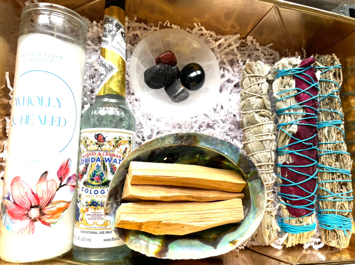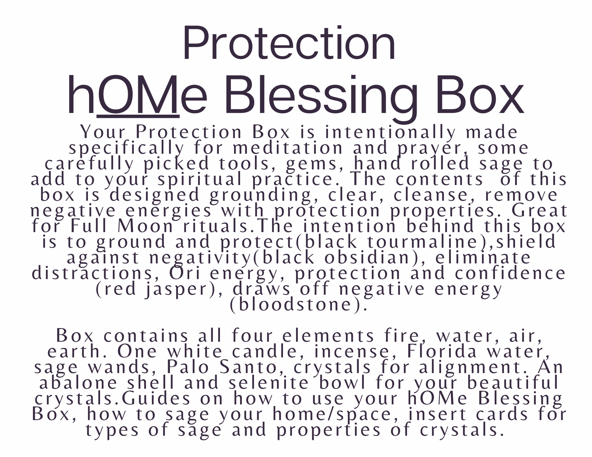 Box contains all four elements fire, water, air, earth. One white candle, incense, Florida water, sage wands, Palo Santo, crystals for alignment. An abalone shell and selenite bowl for your beautiful crystals. Guides on how to use your hOMe Blessing Box, how to sage your home/space, insert cards for types of sage and properties of crystals.